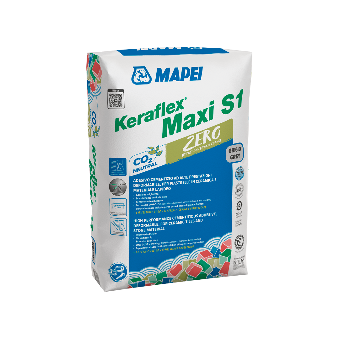 Keraflex Maxi S1 Zero is a high performance, deformable cementitious grey adhesive with extended open time and no vertical slip, for ceramic tiles and large stone slabs. The product has Low Dust technology and very low emission of volatile organic compounds. Keraflex Maxi S1 Zero has certified offsetting of residual greenhouse gas emissions.